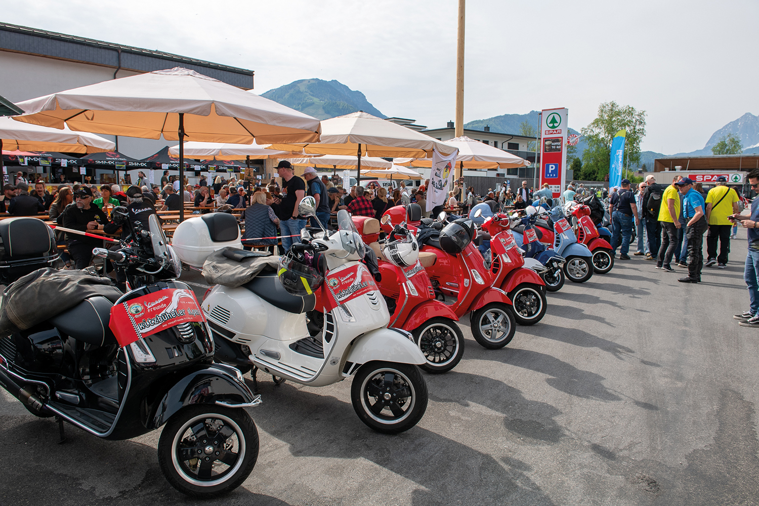 Das Vespa Treffen in Kössen fand heuer bereits zum 4. Mal statt und ist eines der größten in Österreich. 650 begeisterte „Vesparisti“ aus mehren Ländern kamen zum gemütlichen Treffen und präsentierten ihre zweirädrigen Gefährte. Dabei waren alle Variationen von Vespas, verschiedenste Modelle, Baujahre und Farben. Das Treffen stand auch heuer wieder unter dem Motto „ONE HELL OF A RIDE ZUR MOTORRADWEIHE“. Nach dem Weißwurstfrühstück führte die gemeinsame Ausfahrt bei idealem Wetter ca. 42 km durch die Region Kaiserwinkl.