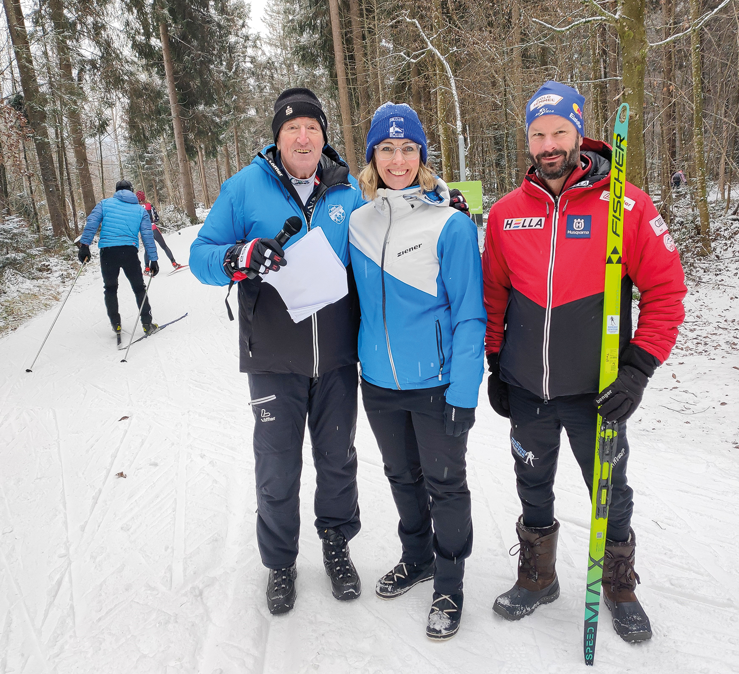 v. l. Platzsprecher Hermann Edler, Skiclub-Obfrau Sabine Schmid und Organisator Markus Weingartner vom Nordic Center.
