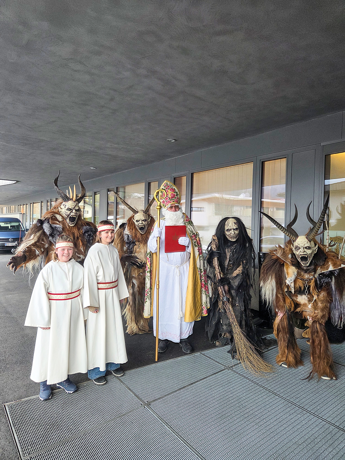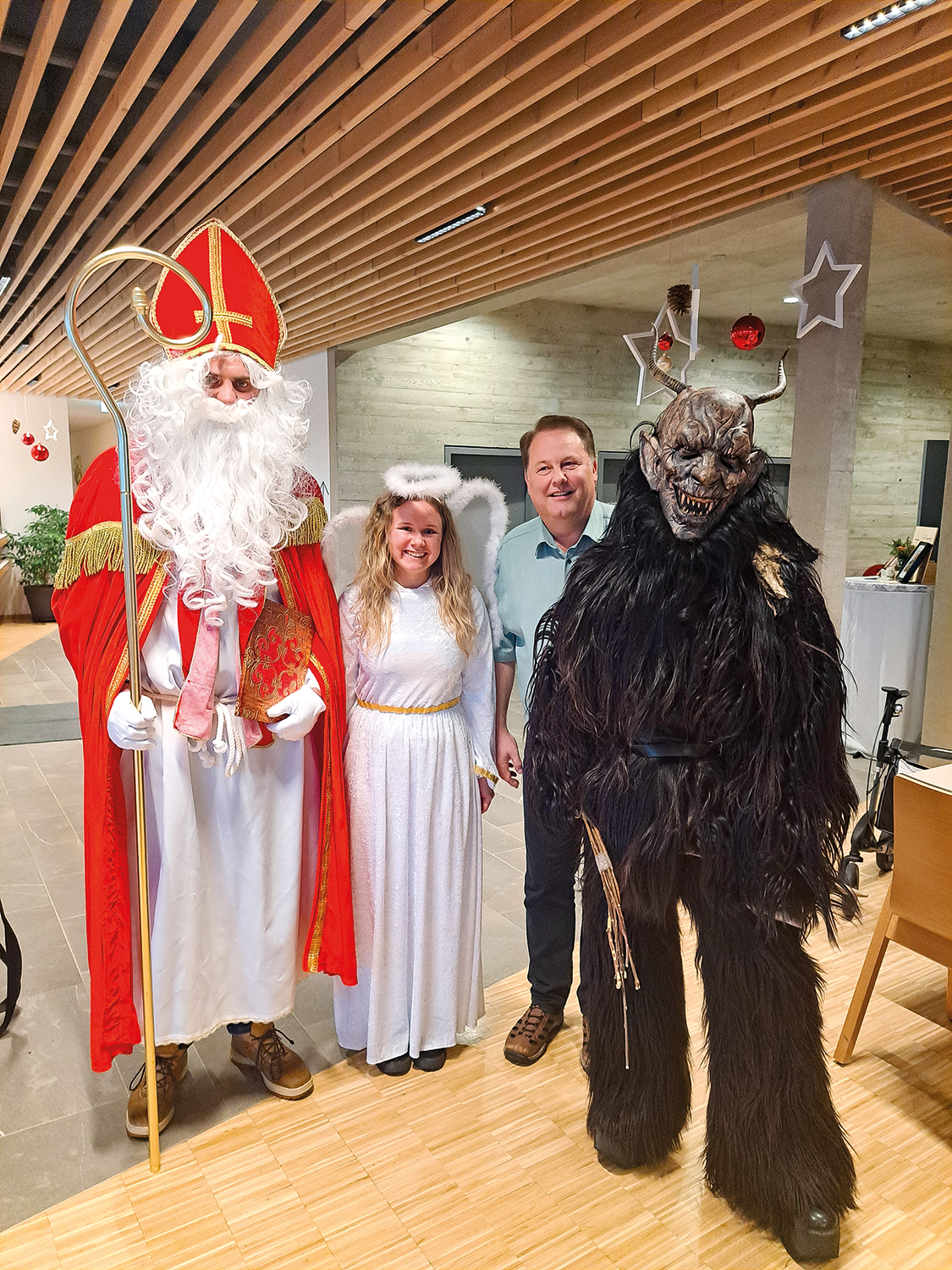 Der Dezember ist ein Monat der großen und kleinen Feiern. So folgte auf den Adventzauber am ersten Adventwochenende die traditionelle Nikolausfeier. Kaffee, Kekse, Mandarinen und ein Glaserl Wein wurden im Sozialzentrum-Café serviert, bevor um drei Uhr nachmittags der Nikolaus anklopfte. Mit einem Engel und zwei Krampussen stattete er den Bewohnern einen Besuch ab und natürlich war sein Sack gefüllt mit Geschenken für die Senioren. „Es ist schon eine kleine Tradition, dass bei uns im Sozialzentrum zwei Nikoläuse vorbeischauen“, schmunzelt Josef Hörfarter. „Am Tag nach der Nikolausfeier besuchte uns noch der Nikolaus der Jungbauernschaft Schwendt. Auch er hatte Geschenke im Gepäck und brachte die Bewohner zum Strahlen. Berührende Momente, die viele an ihre Kindheit und an das Weihnachten von damals erinnerten. Beiden Nikolaus-Gruppen einen herzlichen Dank fürs Vorbeikommen.“ Der Heimleiter dankt zudem allen Spendern der letzten Wochen. Zeit, Selbstgebackenes, Lebensmittel – Geschenke, die von Herzen kommen und Herzen berühren. „Einzigartig war die Spende von Sigi Obermoser, der uns Mandarinen aus Griechenland vorbeibrachte. Alle waren begeistert und sich einig – die Mandarinen waren sensationell.“