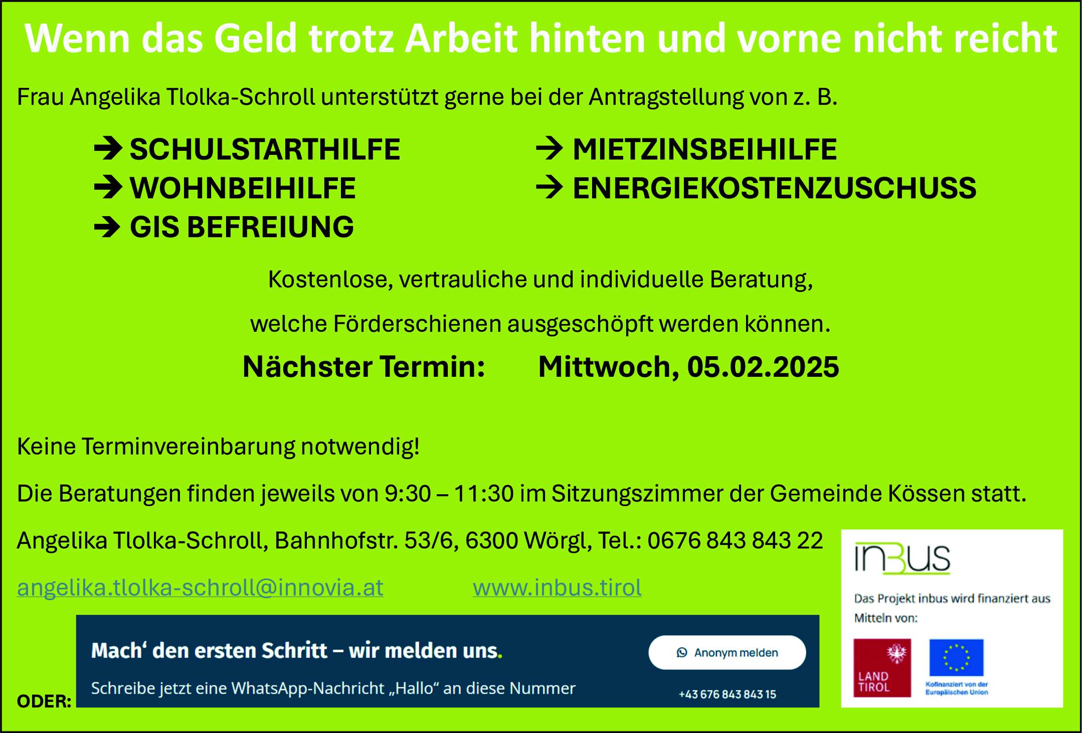 Die Beratungen finden AUSSCHLIESSLICH NACH VORANMELDUNG unter der Telefonnummer +43 664 11 77 449 statt.