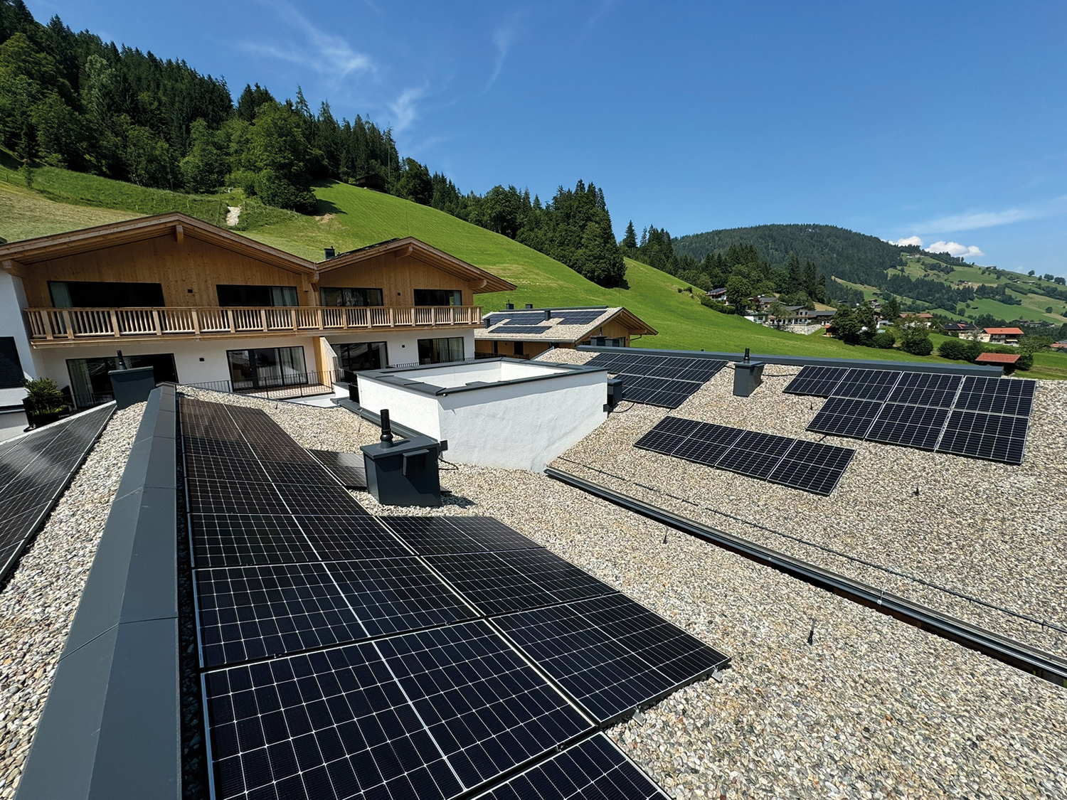 Das neu eröffnete Mount Med Resort in der Wildschönau ist ein Vorzeigeprojekt für nachhaltiges Bauen. Das Resort wurde auf dem historischen Grund des ehemaligen Kellerwirts errichtet und verbindet Gesundheit mit Erholung. Hier wurden die Satteldächer der Chalets teils mit Kies und einer Photovoltaikanlage belegt, teilweise kamen Ziegeldächer zur Ausführung. Zudem erfolgte der Chloridschutz in der Tiefgarage und es wurden großzügige Umkehrdächer mit Terrassenbodenaufbau installiert.