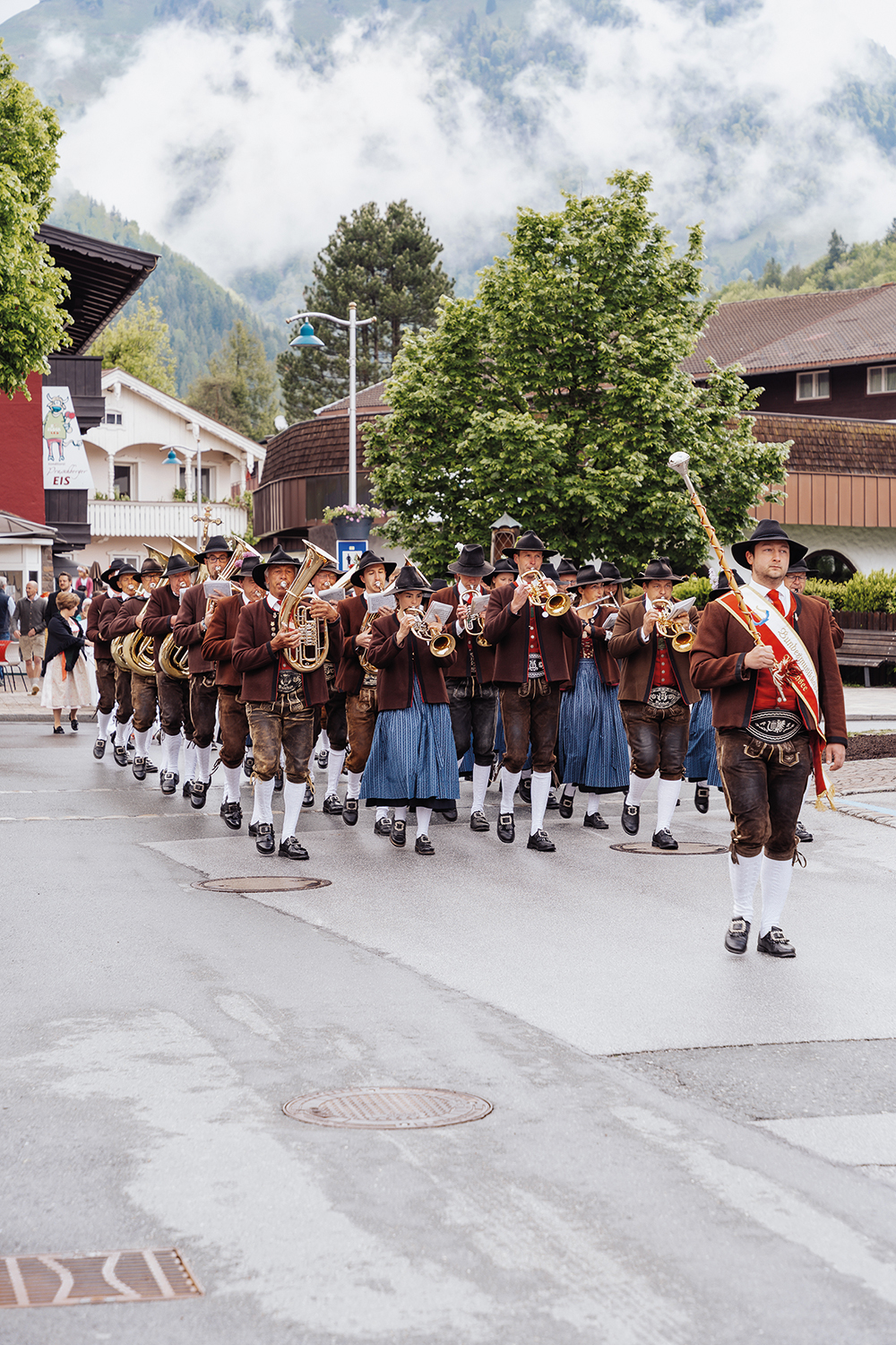 Trotz regnerischer Tage zuvor meinte es das Wetter am Festtag gut: Zwar war der Einzug zunächst fraglich, doch schließlich konnte die Feier trocken – sogar mit einigen Sonnenstrahlen – beginnen. Die festlich gekleideten Kinder trafen sich voller Vorfreude beim Fischerwirt. Von dort zog die gesamte Festgemeinschaft – angeführt von Pfarrer Dr. Rainer Hangler, begleitet von der Bundesmusikkapelle Walchsee, Bürgermeister Ekkehard Wimmer, Direktorin Verena Gapp, den Lehrerinnen und den Familien – in die feierlich geschmückte Kirche ein.