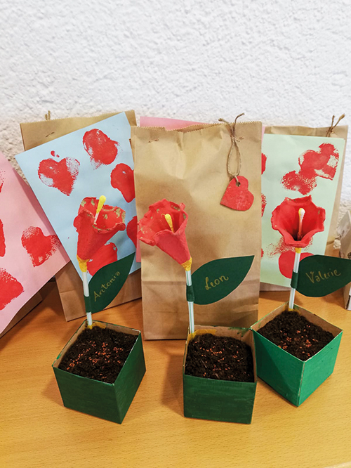 Da der Muttertag auf den zweiten Sonntag im Mai fällt, wurde in den ersten Maiwochen noch fleißiger gebastelt als sonst. Mit großem Eifer bastelten die Kinder kleine Blumentöpfe aus Karton, schmückten diese mit einer gebastelten Blume und füllten die Töpfe mit Erde und Kressesamen. Verpackt wurde das Geschenk in liebevoll gebastelte Papiertüten mit Karte. Ebenso fleißig studierten die Kinder ein Muttertagslied ein. Dazu wurde das Lied „I sing a Lied fi di“ von Andreas Gabalier umgedichtet. Vor allem der Schluss gefiel den Kindern besonders gut und hier stimmten sie besonders textsicher ein: