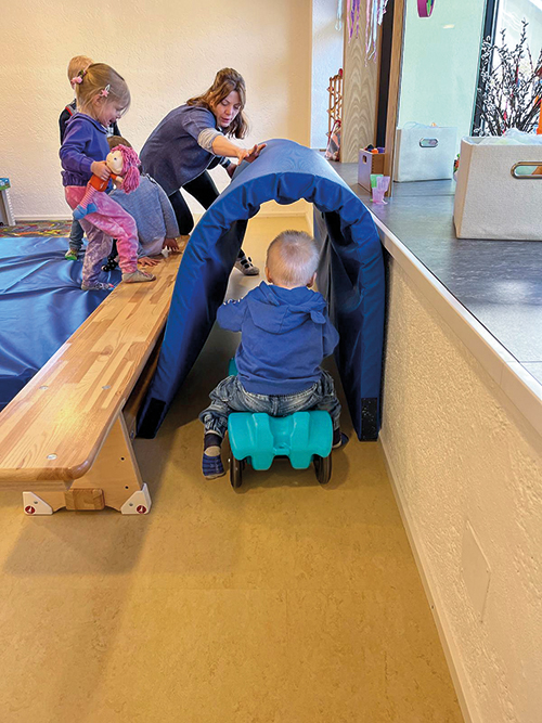 Ein weiteres Highlight in diesem Monat war die im Turnraum aufgeklebte Straße, die die Kinder mit den Rutschautos passieren konnte. Tankstraße, Waschstraße und Werkstatt hoben den Spaßfaktor zusätzlich.