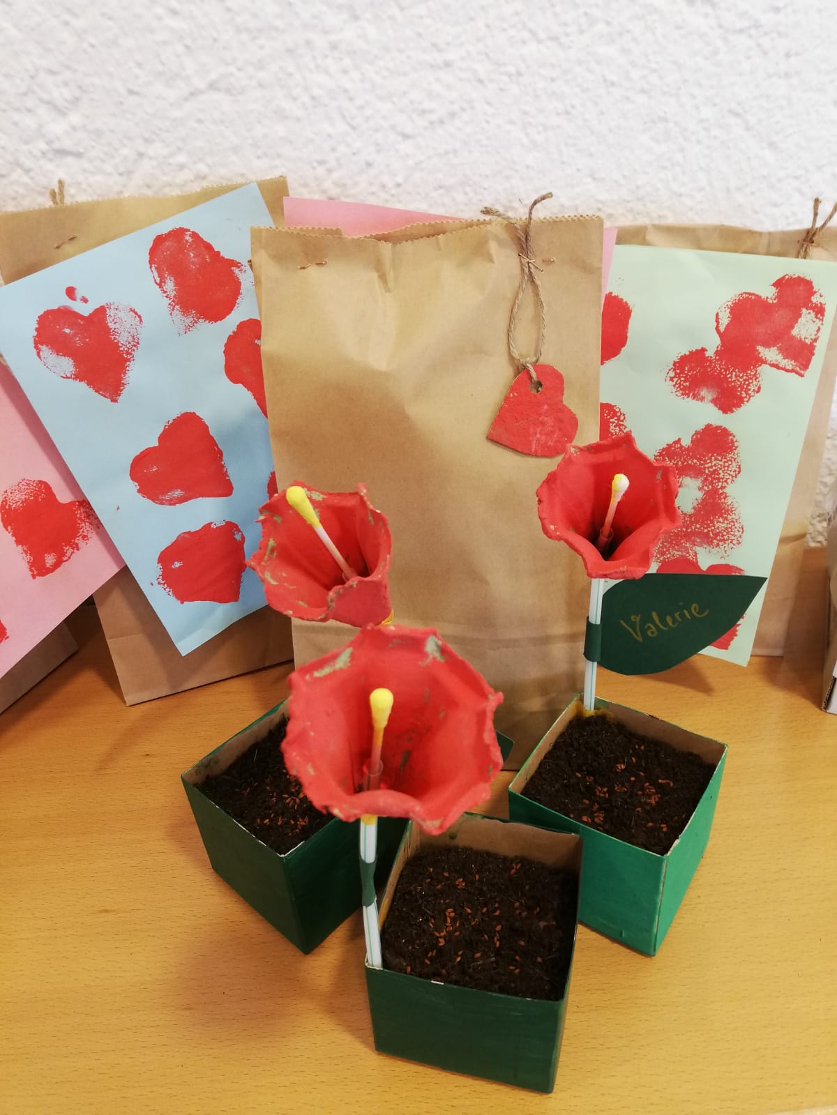Da der Muttertag auf den zweiten Sonntag im Mai fällt, wurde in den ersten Maiwochen noch fleißiger gebastelt als sonst. Mit großem Eifer bastelten die Kinder kleine Blumentöpfe aus Karton, schmückten diese mit einer gebastelten Blume und füllten die Töpfe mit Erde und Kressesamen. Verpackt wurde das Geschenk in liebevoll gebastelte Papiertüten mit Karte. Ebenso fleißig studierten die Kinder ein Muttertagslied ein. Dazu wurde das Lied „I sing a Lied fi di“ von Andreas Gabalier umgedichtet. Vor allem der Schluss gefiel den Kindern besonders gut und hier stimmten sie besonders textsicher ein: