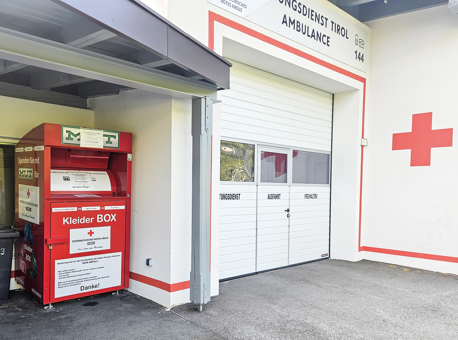 Von deiner Kleiderspende in die Rot-Kreuz-Sammelcontainer, welche sich an verschiedensten Orten bei uns im Bezirk befinden. Bei uns im Kaiserwinkl ist ein solcher etwa direkt vor der Rettungswache in Kössen. Deine Spenden werden dort wöchentlich abgeholt und direkt über die Kleidersortierung zum Kleiderladen gebracht.