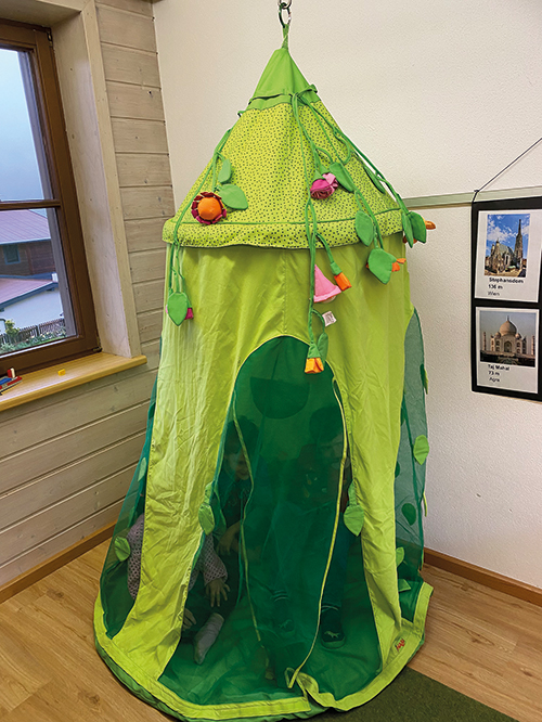 … an Frau Viktoria Mühlberger, die mit großem Aufwand unser Lese- und Hörspielzelt restauriert hat. Es erstrahlt nun wieder in neuem Glanz und wird gerne als Rückzugsort zum Lesen von Büchern und Hören von Hörspielen genutzt.