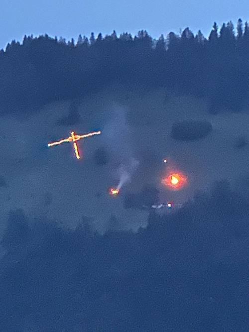 Das Wetter war am eigentlichen Wochenende der Sommersonnenwende leider nicht so wie erhofft und so beschlossen wir, das traditionelle „Feuerbrennen“ um eine Woche zu verschieben. Am späten Nachmittag machten wir uns auf zur Lippenalm, wo wir unsere Fackeln dankenswerterweise aufstellen durften. Bei Einbruch der Dämmerung wurde schließlich das Feuer entzündet und vom Dorf hinauf konnte man unser gestecktes Kreuz in voller Pracht beobachten. Diese altbewährte Tradition bereitete uns wie jedes Jahr große Freude, sodass wir den Abend gemeinsam und zufrieden ausklingen lassen konnten.