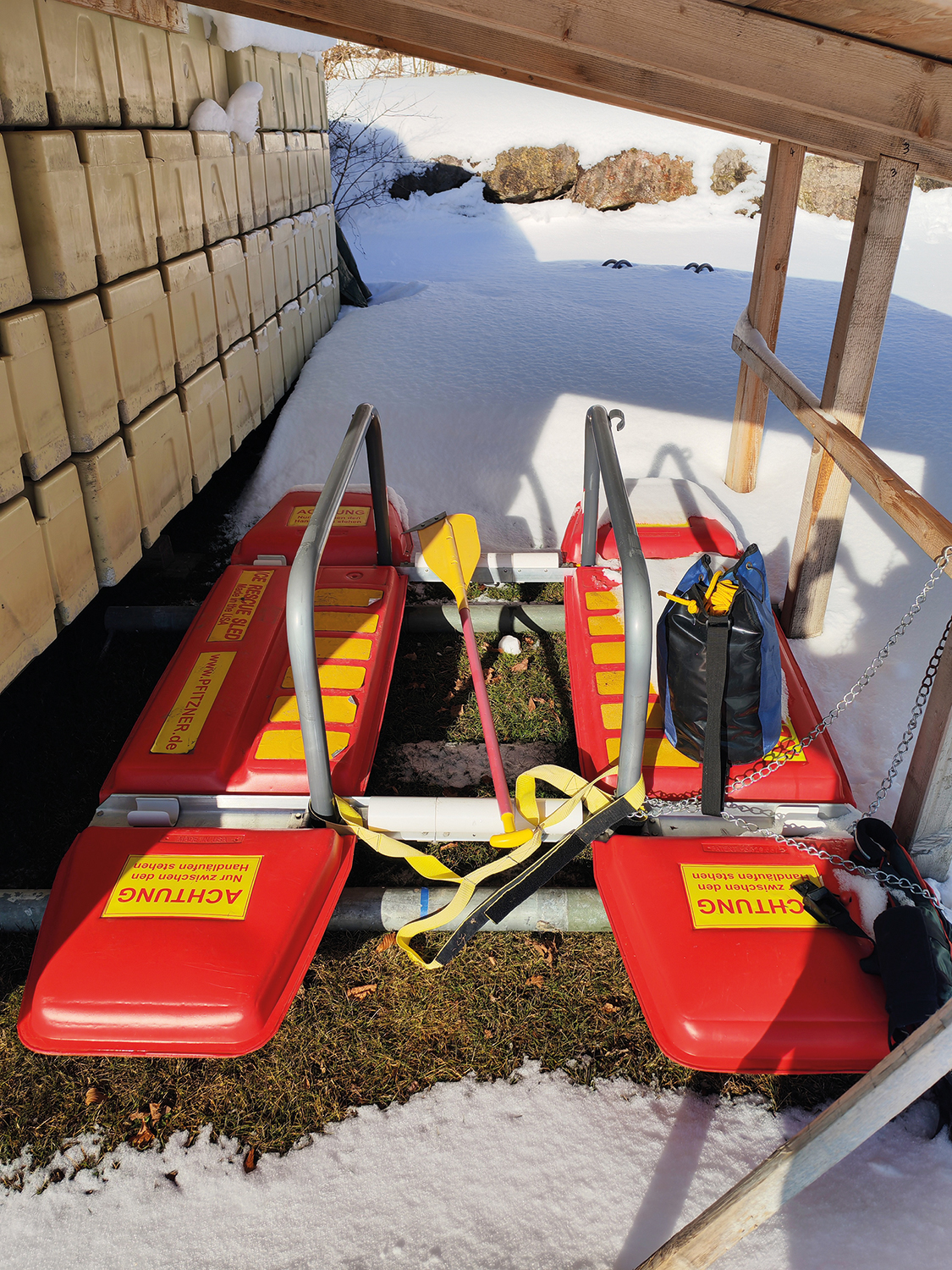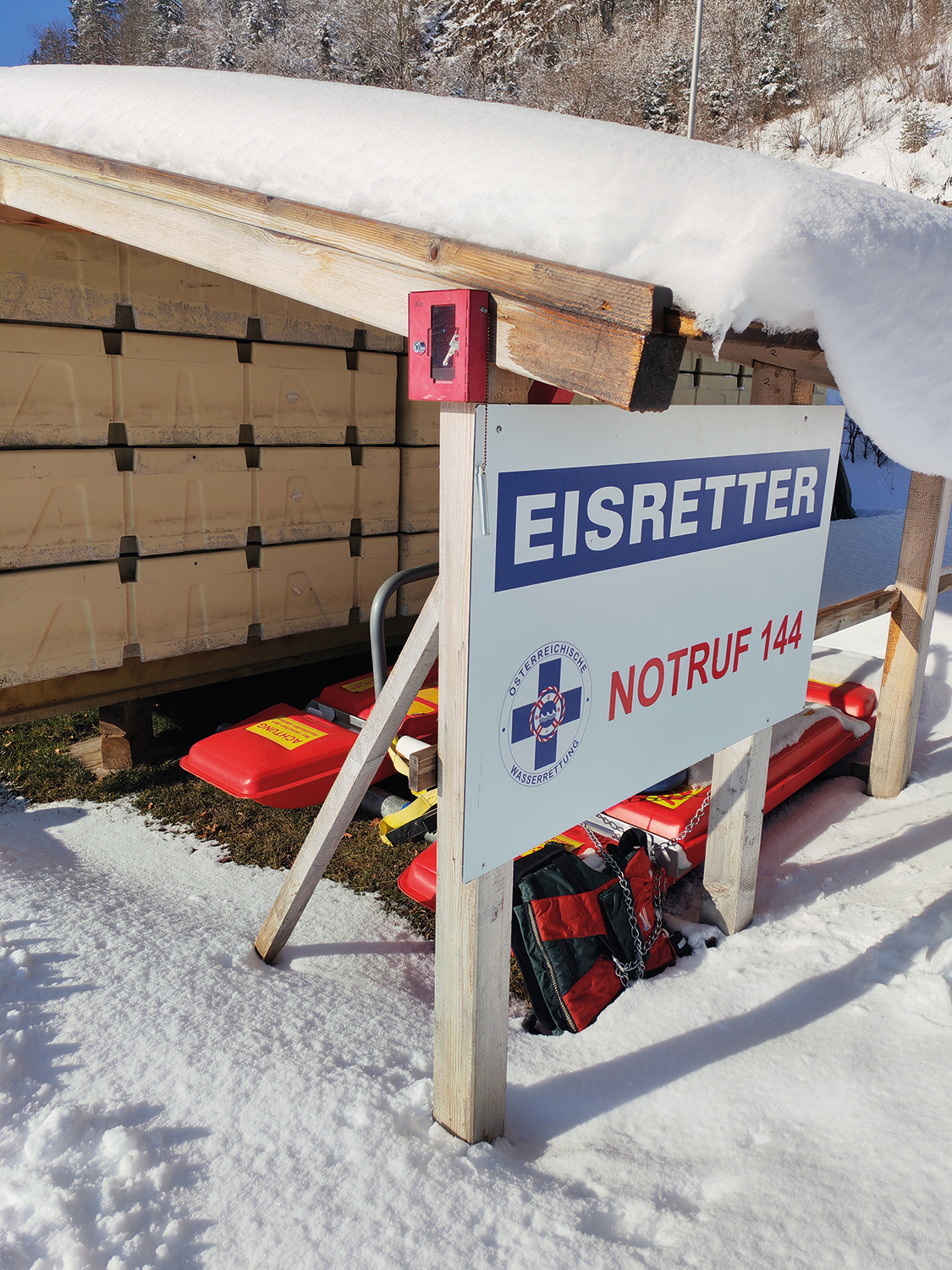 Der „Eisretter“ (auch „Eisrettungsschlitten“ genannt) steht in den Wintermonaten für JEDEN der eine in Not geratene Person erkennt, an der Seepromenade Walchsee, neben dem Cafe See la vie bereit und ermöglicht durch die beiden Schwimmkörper, sich auf dünnem Eis fortzubewegen, ohne einzubrechen und dient dazu, eine Person aus dem eiskalten Wasser zu ziehen oder an Land zu bringen, ohne dass der Retter selbst in Gefahr ist.