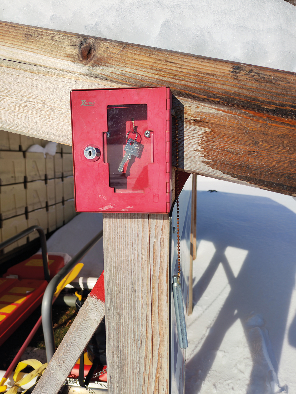 - Schutzscheibe vom Schlüsselkästchen einschlagen und mit dem Schlüssel die Kette aufsperren, um das Equipment entnehmen zu können.