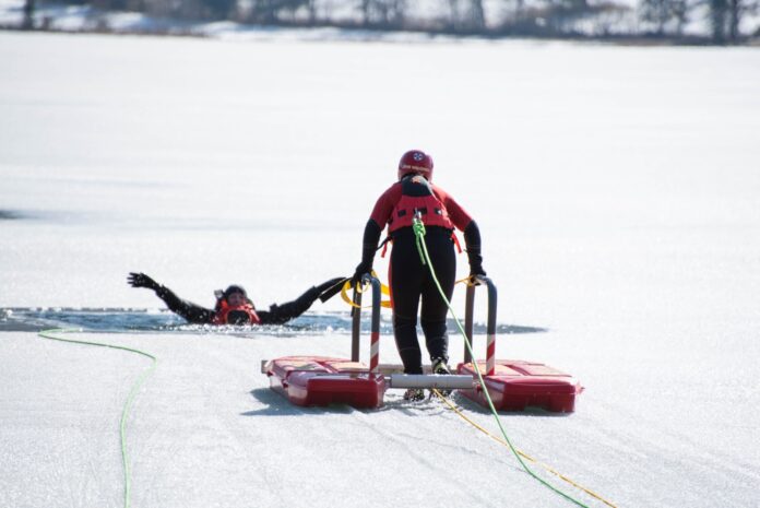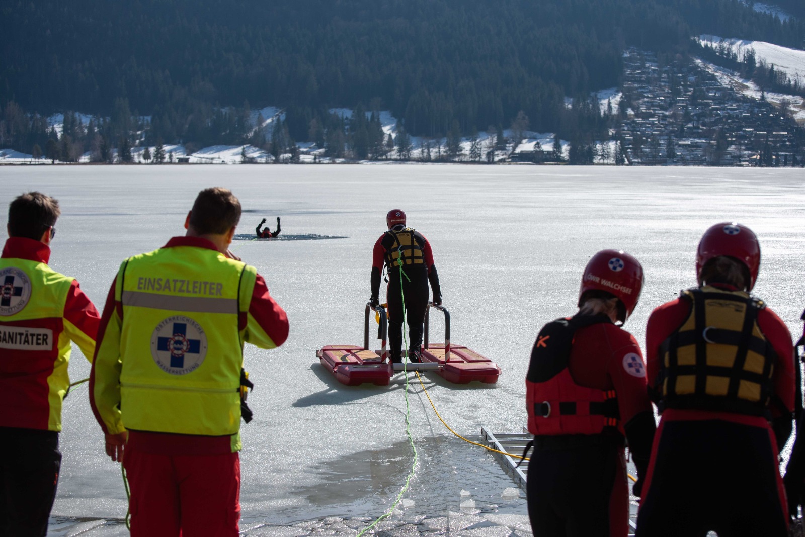 - Ein Helfer an Land hält das Ende der Leine des Eisretters fest und hilft damit beim Zurückziehen an das Ufer.