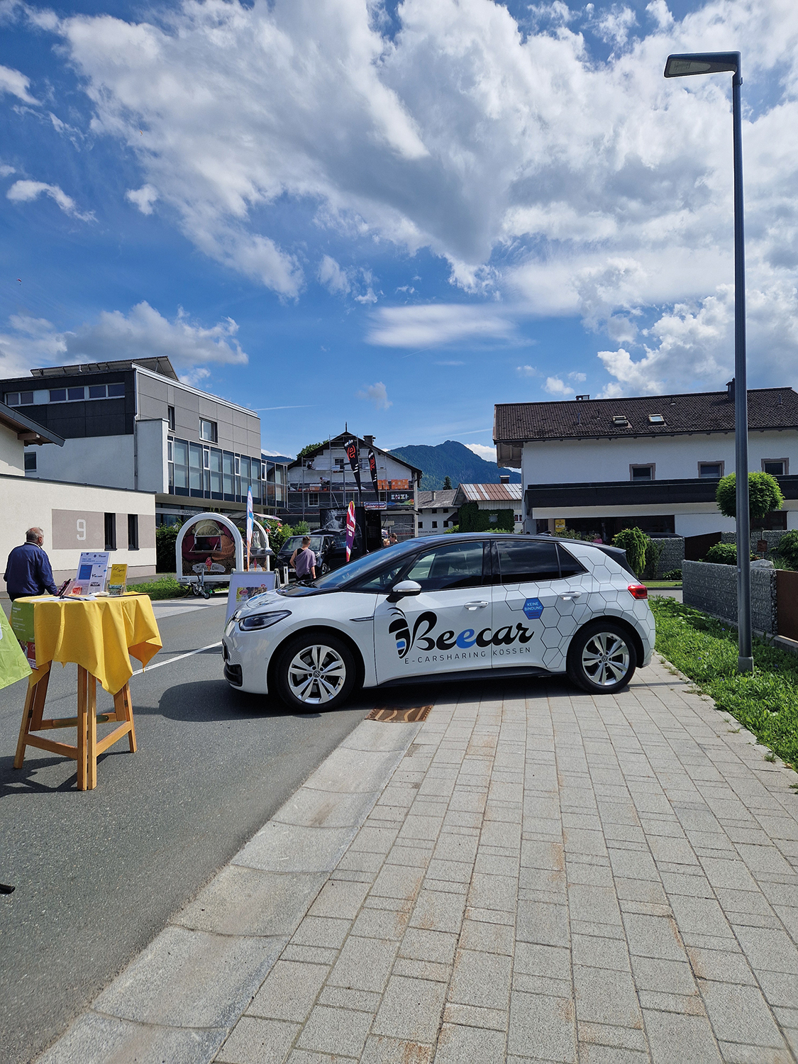 Nachhaltige Mobilität brachte das Ortsmarketing in Form des Kössener Beecars zum GriaßDi! Straßenfest. So hatten Interessierte die Möglichkeit, im Beecar Probe zu sitzen, sich für eine Testfahrt anzumelden und sich über das E-Carsharing-Angebot der Gemeinde Kössen zu informieren. Neben der umweltfreundlichen Nutzung und der Kostenersparnis waren die Festbesucher von der einfachen Buchung des E-Autos via App angetan. Darüberhinaus war natürlich auch die Aktion „Tirol radelt“ mit ein Gesprächsthema am Ortsmarketingstand. „Unser Ziel war es, noch mehr Menschen auf die Initiative aufmerksam zu machen. Einige der Festbesucher nutzten dann auch die Möglichkeit und meldeten sich direkt an, um den Sommer über für Kössen zu radeln“, freut sich Ortsmarketing-Mitarbeiterin Tamara Dagn.