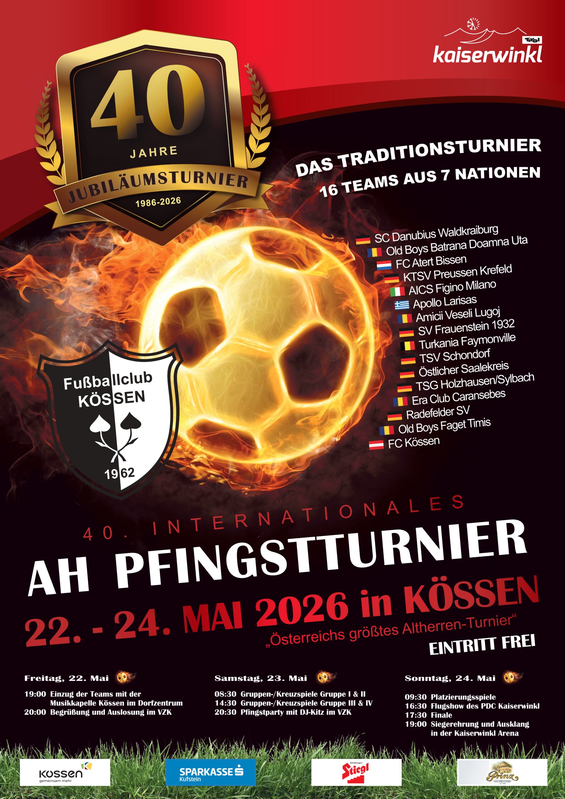 Vom 22. bis 24. Mai steht Kössen ganz im Zeichen eines besonderen Meilensteins: Der Fußballclub Kössen feiert „40 Jahre Alt‑Herren‑Turnier“ – vier Jahrzehnte voller Leidenschaft, internationaler Freundschaften und unvergesslicher Fußballmomente.