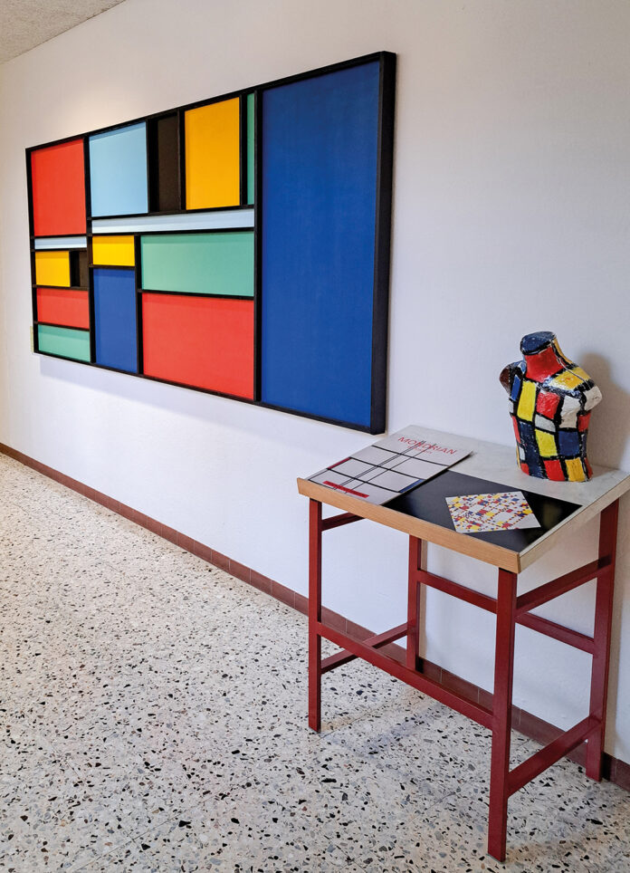 So erhielten die SchülerInnen Einblicke in die Arbeiten von Jean Michelle Basquiat, in die Bildgeschichte der „Drei Schwestern“ von Audrey Niffenegger und in die Werke des Tiroler Künstlers Peter Kogler (Ameisen). Außerdem präsentierte er Masken zum Karneval in Venedig, zum Teil selbstgefertigt von seiner Enkelin, Leonie Kreisern-Kürzl. Heuer kreierte er selbst, zusammen mit seiner Frau, eine Variation über die geometrischen Kompositionen von Piet Mondrian (im Bild). Trotz Einschränkungen im Sehbereich schuf er eine Installation, die er unserer Mittelschule zur Verfügung stellte, inklusive eines erklärenden Katalogs. Die im Zuge eines Projekts im Vorjahr erstellte Mondrian-Büste von zwei Schülern der 4B, Michael Hechl und Kevin Bencinger, passt genau zu diesem Konzept. Vielen Dank an unsere engagierten SchülerInnen und an Wolfgang Kürzl!