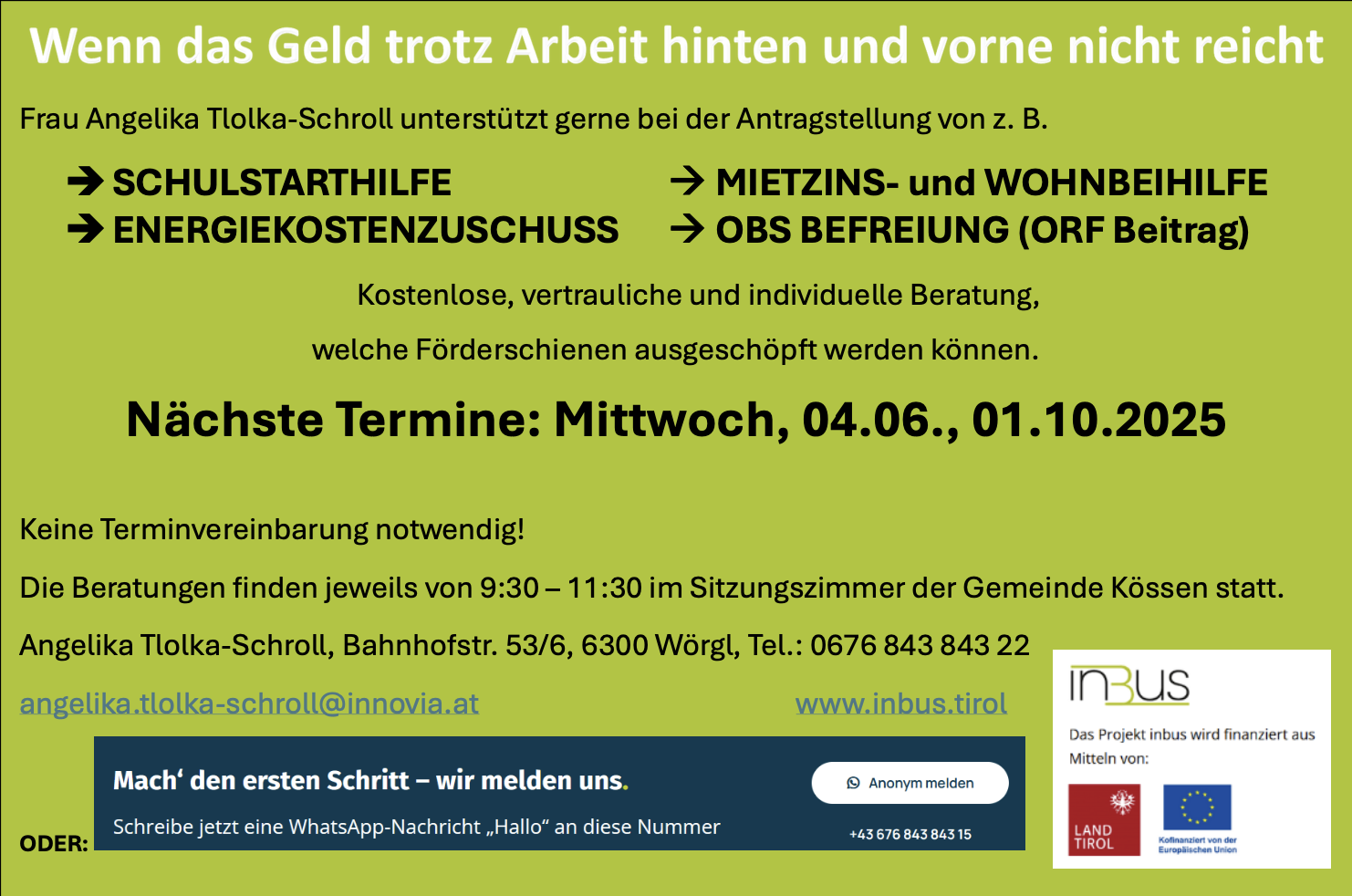 - Nur vollständige Förderanträge, die bis einschließlich 30. Juni 2025 im Gemeindeamt Kössen eingereicht werden, können noch berücksichtigt werden.
