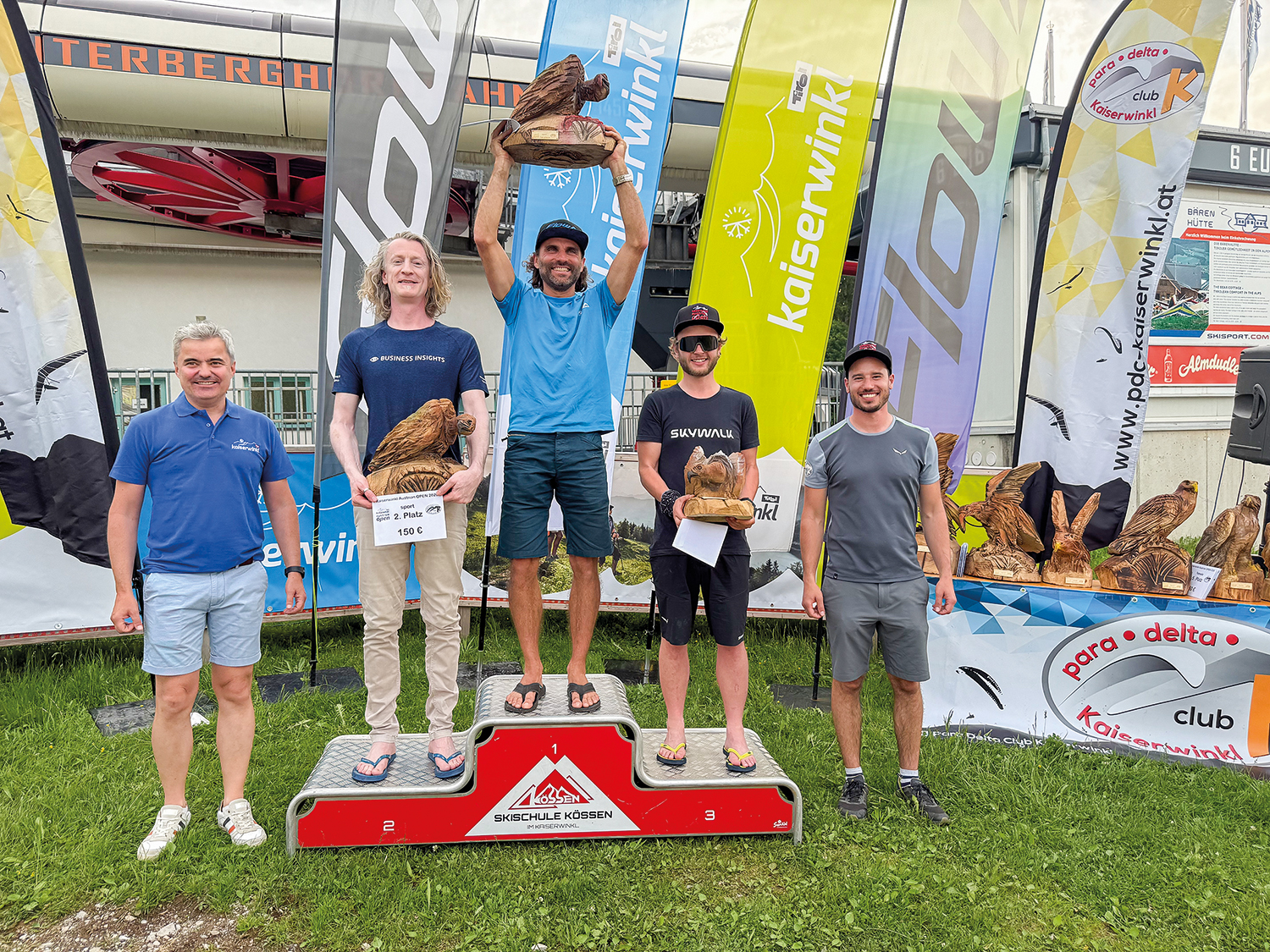Der erste Task am Freitag hatte es durch schwere Startbedingungen und starken Westwind gleich in sich und führte die Teilnehmer und Teilnehmerinnen auf einen 55 km langen Zickzackkurs zwischen Unterberghorn, Schnappen, Peternhof und Zahmen Kaiser hin und her. Begrüßt wurden die 68 Pilotinnen und Piloten, welche die komplette Aufgabe schafften und den Landeplatz erreichten, nicht nur von applaudierenden Zuschauern und Fliegerkollegen, sondern auch von den „Skipping Stones“. Diese sorgten bis in die frühen Abendstunden für wohlige Klänge und gute Stimmung.