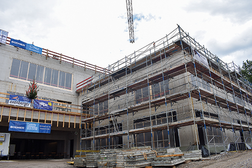 Am 8. August wurde die Firstfeier des Bildungszentrums begangen. Besonders erfreulich war, dass viele Geladenen kamen – von den Handwerkern über die Planer bis hin zu den Bauhof- sowie Verwaltungsmitarbeitern – um gemeinsam die Dachgleiche zu feiern. Das Rohbaugebäude ist somit fertig, wir sind exakt im Zeitplan, alles läuft wie geplant. Die Installationsarbeiten im gesamten Gebäude sind inzwischen weit fortgeschritten, die Fassadenarbeiten sind erfolgreich im Laufen.