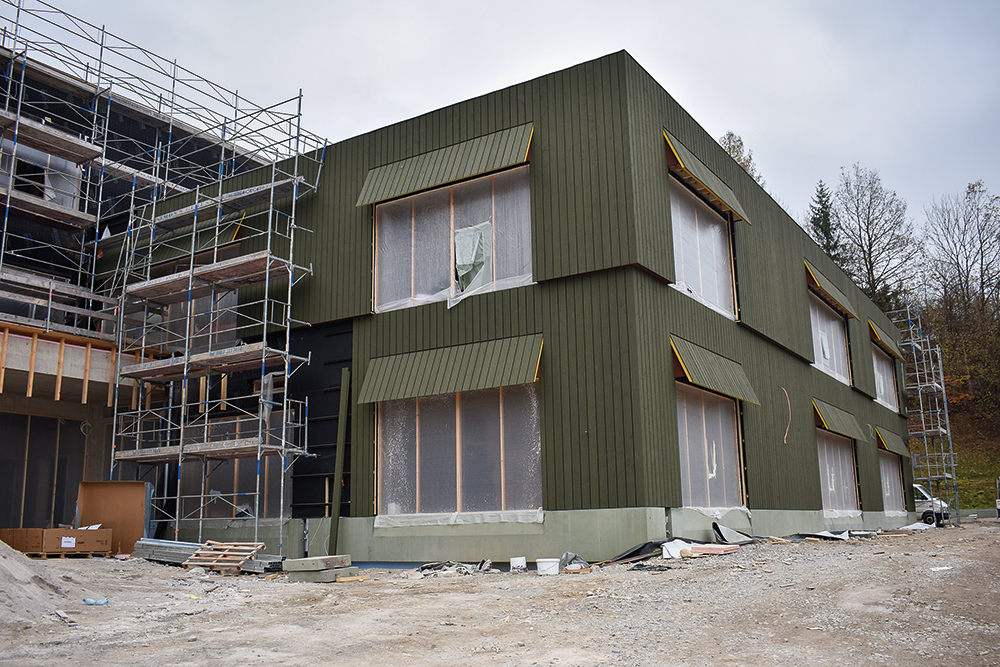 Sämtliche Estricharbeiten sind inzwischen abgeschlossen, die Verputzarbeiten sollen noch heuer erfolgreich beendet werden. Was sich bereits jetzt zum Teil zeigt, ist die Holzfassade des Gebäudes, da Teile des Gerüsts schon abgebaut werden konnten. Für die Fassade wurden Fichtenholzbretter verwendet, die in olivgrüner Farbe getaucht wurde. Durch die gewählte Farbe und das natürliche Material passt sich das Bildungszentrum sehr gut an den Hintergrund an. Ein Punkt, der uns bei der Planung äußerst wichtig war, da das Haus durchaus große Ausmaße hat.