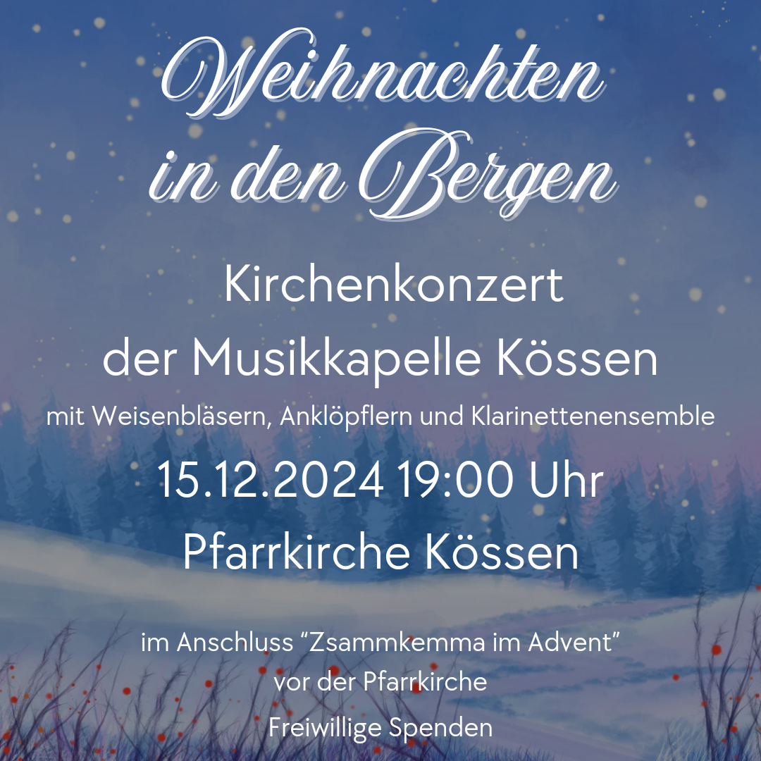Heuer gestalten wir am 15. Dezember um 19:00 Uhr ein Kirchenkonzert unter dem Motto „Weihnachten in den Bergen“ in der Pfarrkirche Kössen. Neben einem buntgemischten Programm von uns, sind noch Weisenbläser, Anklöpfler und unser Klarinettenensemble mit dabei. Umrahmt wird das ganze mit Texten passend zur „staaden Zeit“. Anschließend gibt’s noch das ein oder andere Heißgetränk vor der Pfarrkirche im Rahmen von „Zsommkemma im Advent“. Wir freuen uns auf zahlreiche ZuhörerInnen!