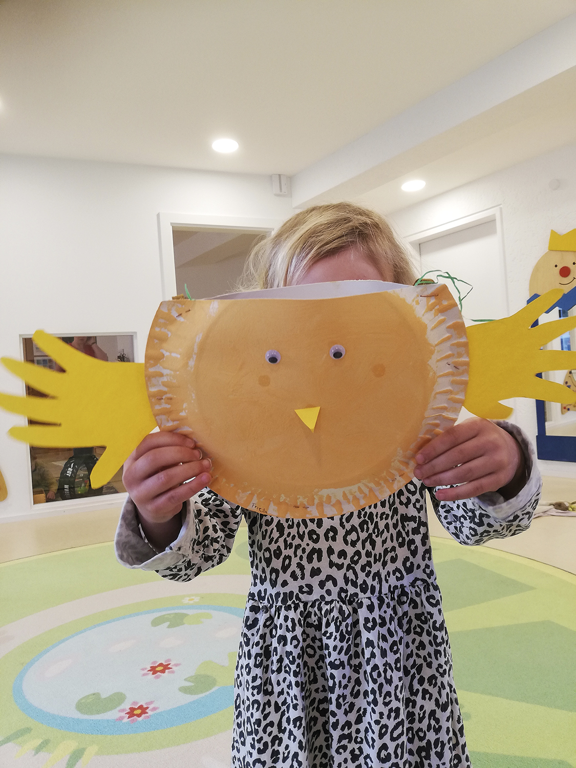 Auch die Vorbereitungen auf Ostern durften nicht fehlen. Mit viel Begeisterung bastelten die Kinder süße Osterküken aus Papptellern, die zugleich als kleine Nester dienten. Diese wurden liebevoll gestaltet, damit der Osterhase später kleine Überraschungen hineinlegen kann.