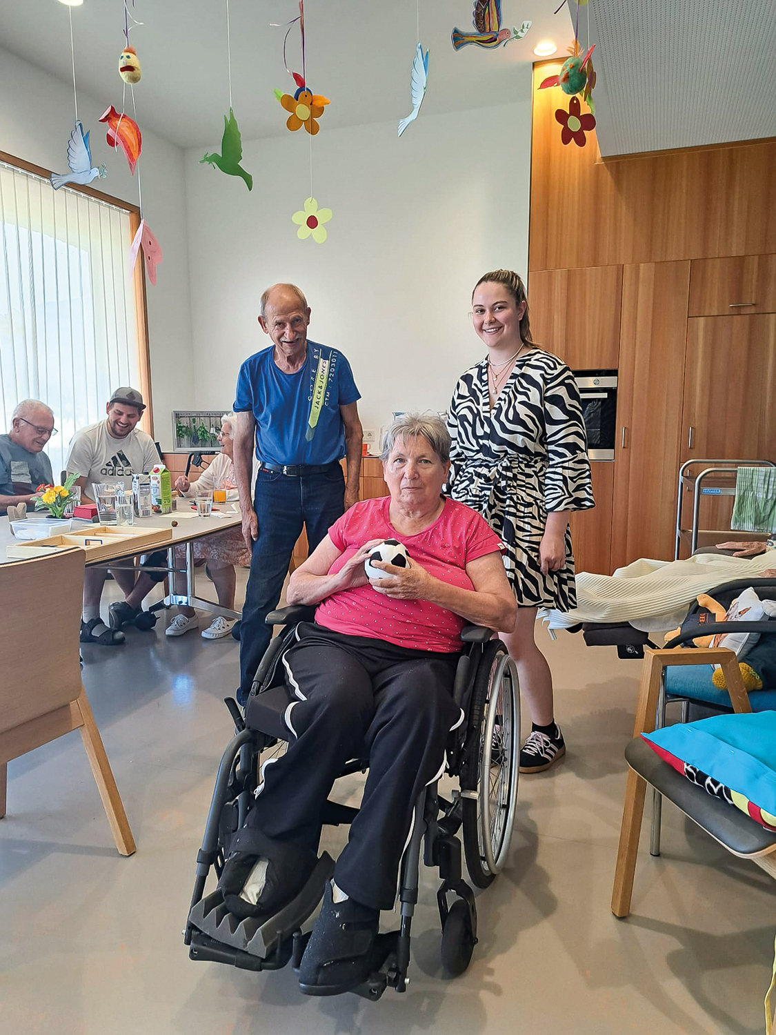 Tagesbetreuung: Im Juni besuchten uns zwei Mitglieder der Jungbauernschaft-Landjugend Schwendt, Emma und Martin, und verbrachten einen ganzen Nachmittag mit unseren Besuchern. Dabei kamen die selbstgebastelten Spiele (von den Jungbauern Schwendt) zum Einsatz. Es wurde gewürfelt, Fußball gespielt, in der Fühlbox einiges entdeckt und vor allem viel gelacht. Für unsere Besucher war es eine tolle Abwechslung und alle hatten sichtlich Spaß daran. Liebe Emma, lieber Martin nochmals ein herzliches „Danke“ für euren Besuch – das war eine großartige Idee.