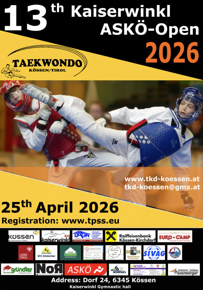 Auch im Februar stand beim TKD Kössen wieder einiges auf dem Plan. Unter anderem ein Kadertraining und ein Grand-Prix-Qualifikationsturnier in Albanien, bei welchen Aaron Lechthaler teilnahm. Leider verpasste er knapp den Sieg und schied somit in der Vorrunde aus. Der Frühling steht bei der Kössener Taekwondo-Gemeinschaft auch immer im Zeichen der Vorbereitung für unsere Kaiserwinkl Askö Open. Am 25. April dürfen wir wieder Sportler, Eltern und Fans in der 3-fach Sporthalle in Kössen zu einem unvergesslichen Tag begrüßen. Kommt vorbei und erfreut euch an spannenden Kämpfen, leckeren Burgern, Würstel, Kuchen und mehr.