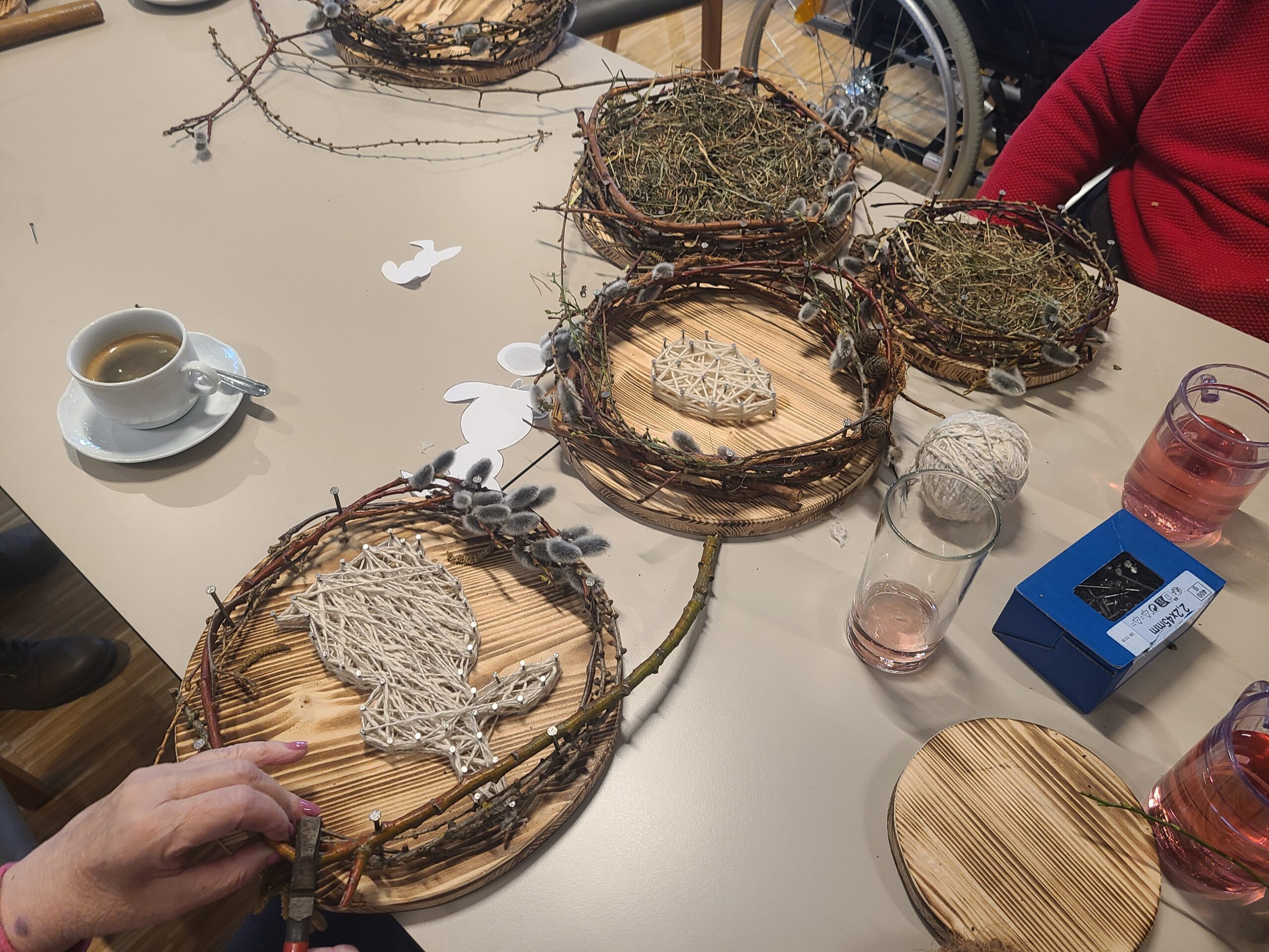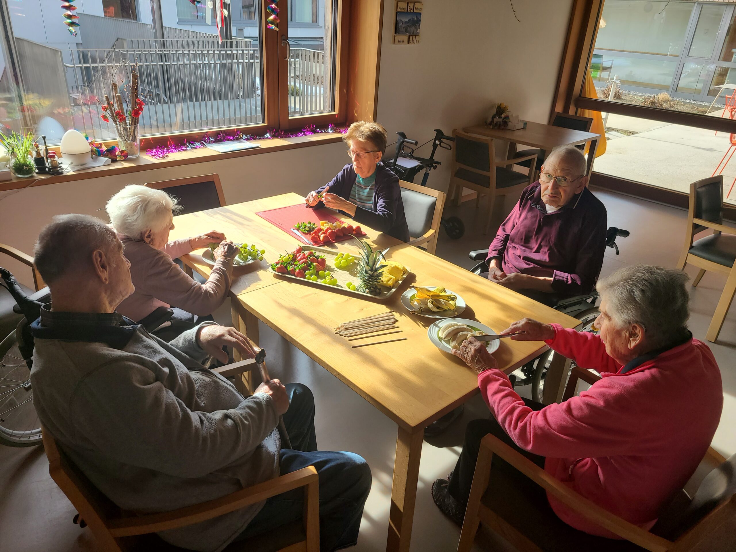 Frische Obstspieße mit knackiger Schokolade überzogen – herrlich. Das dachten sich auch die Bewohner, als sie ihre selbst zubereitete Köstlichkeit verspeisten. Eine Gruppe unserer Senioren bereitete mit großer Begeisterung jede Menge dieser Fruchtspieße zu, die am Nachmittag schließlich an alle verteilt wurden, wie Josef Hörfarter erzählt. „Die Nachfrage war riesig, das Feedback grandios. Wir haben daher sofort entschieden, dass wir diese Fruchtspieß-Aktion in Zukunft öfter durchführen werden.“ Selbst aktiv wurden die Senioren im März auch beim Basteln von Frühlingskörben. Tom Hörfarter hatte dem Sozialzentrum dafür extra Holzscheiben vorbereitet und als Geschenk vorbeigebracht. Bastelarbeiten wie diese sind wichtig für die Aktivierung, fördern sowohl die Fein- als auch die Grobmotorik. Dazu erzeugt das eigene Tun Erfolgserlebnisse, die mitentscheidend für eine positive Stimmung sind.